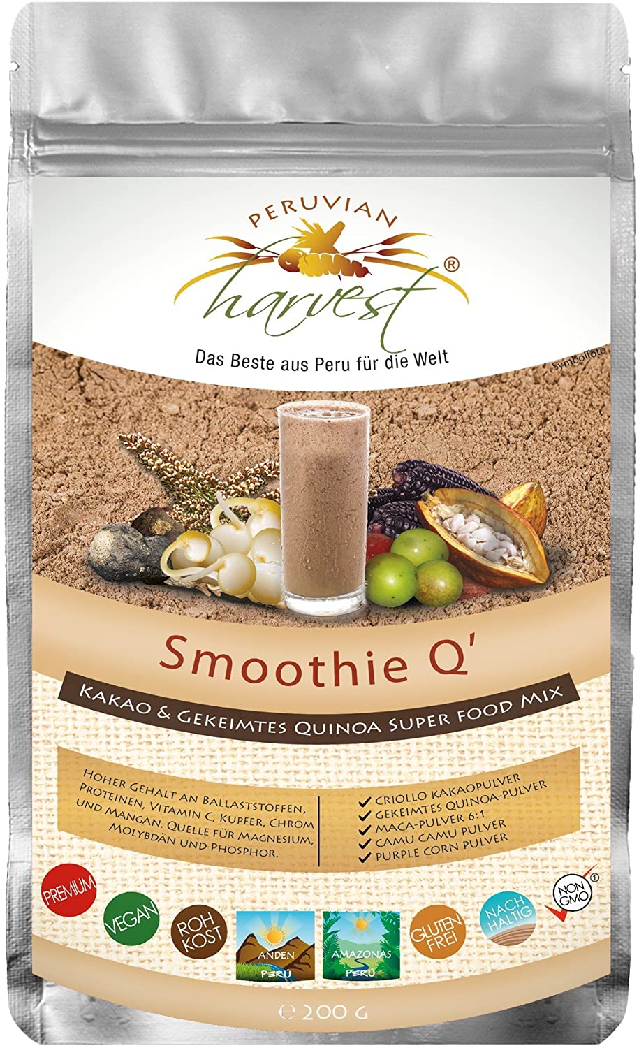 Quinoa is a plant original to the Andean region of Peru. Known by the Incas as 'Cisaya Mama' (Mother of All Grains) it is well known due to its nutritional composition, containing essential amino acids among other nutrients. Peruvian Harvest's Raw Sprouted Quinoa Powder is made from select quinoa grains and processed through their unique sprouting and cold drying process in order to obtain a great product with all of the natural nutrients intact.